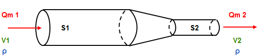 Une des lois fondamentales de la mécanique des fluides est la loi de conservation du débit massique (*) Elle exprime le fait que la masse (M) de fluide entrant dans un système pendant un temps T est égale à la masse sortant de ce système pendant ce même temps T. En d’autres termes, il n’y a pas de « stockage » ou « perte de masse » dans le système.