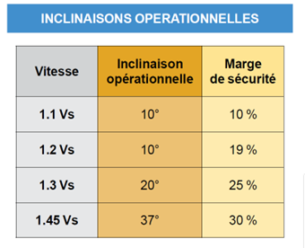 Les différentes vitesses correspondent à des majorations de la vitesse de décrochage, avec différents coefficients multiplicateurs. Pour chacune d’entre elles, on indique une inclinaison maximum à ne pas dépasser et la marge de sécurité par rapport à la vitesse de décrochage associée.