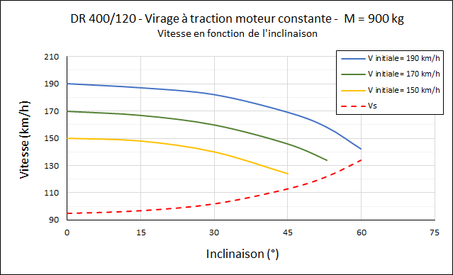 Le graphique ci-dessous présente l’évolution de la vitesse pour différentes inclinaisons. Plusieurs vitesse initiales avant inclinaison sont indiquées.
